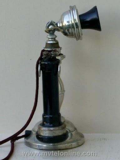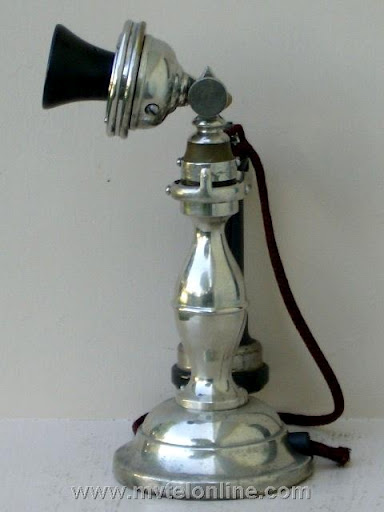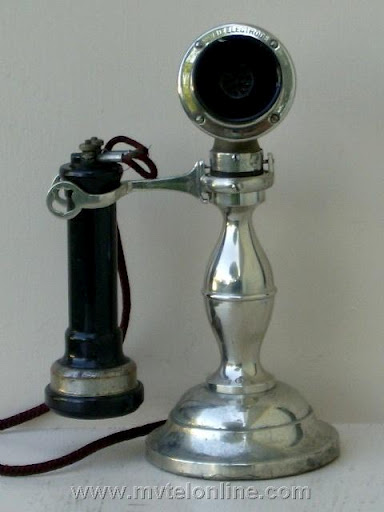 American Electric "Potbelly" candlestick telephone. Early candlestick telephones were made to be attractive. This particular antique telephone has a small transmitter and a "Burns" long pole receiver.