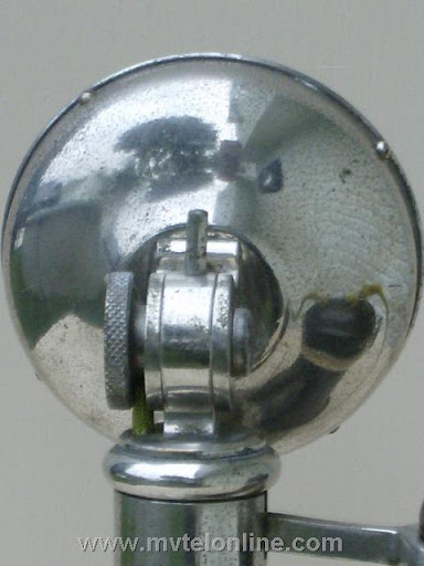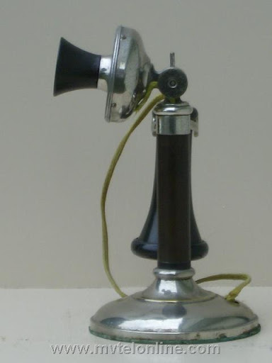 Kellogg candlestick telephone ca 1901. This is a very early version of a Kellogg stick. This antique telephone has a very wide weighted base. The receiver is an early version not seen on later phones. The transmitter faceplate has a beveled edge and is nicely embossed. The transmitter cup is held on by a bolt and thumbscrew. The is a little pin at the top of the perch to stop the transmitter from tilting back to far.