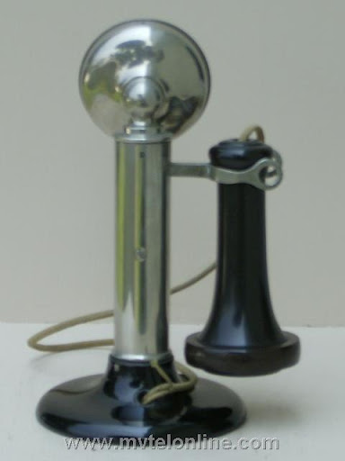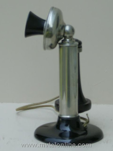 North manual candlestick telephone. This early straight shaft antique telephone is nicknamed the "Thick Shaft". The base is very small cast iron painted black, the shaft is thicker than most candlestick phones. It is nickel plated brass.