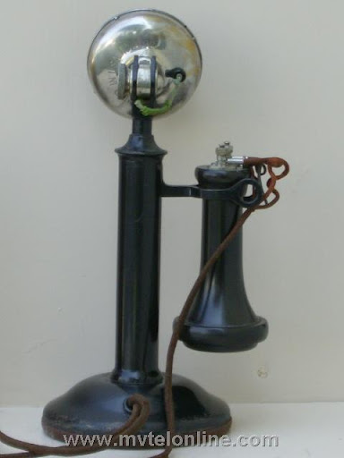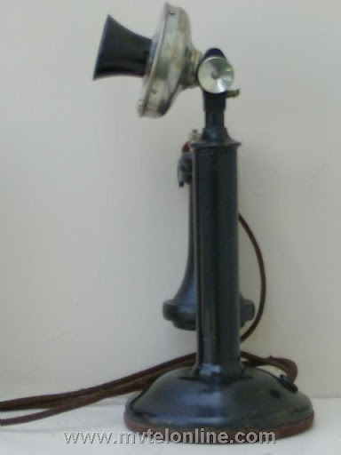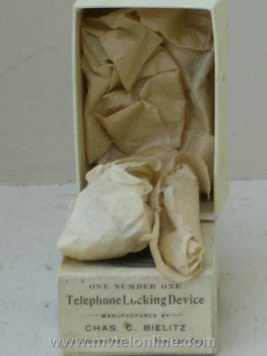 Western Electric 20S candlestick telephone. The 20S is a 20B but instead of being nickel plated is painted black. This antique telephone is equipped with a Western Electric ost "pony" receiver and a 7 digit transmitter. It is connected to it's original wood subset. Note the NOS Bielitz telephone locking device at the lower center.