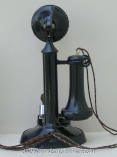 Western Electric 50C candlestick telephone. This antique telephone is equipped with a 2AB metropolitan dial with numbers and letters porcelain dial plate. It is still connected to it's original subset. This telephone was originally installed in Brooklyn NY. Note the rubber advertising attachment on the base.. For sale, $500.