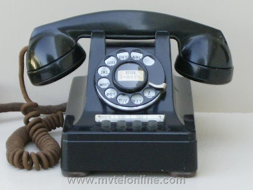 Western Electric 440 desk phone. This 1940s or 1950s era telephone a multi-line version of the 302 telephone. It is equipped with nice brown colored cloth covered cords. the phone is equipped with 4 line keys.