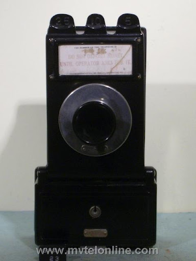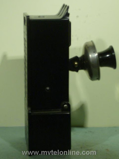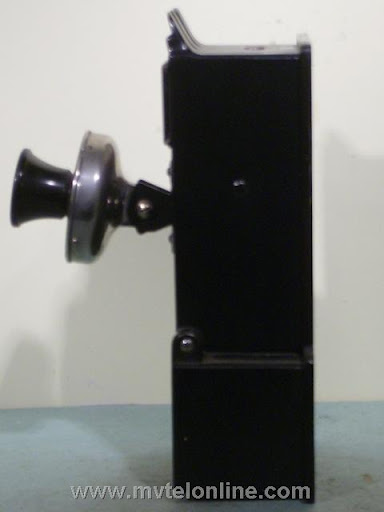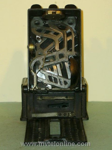 Gray #23, this paystation mounts to the front of an antique wood wall telephone in place of the transmitter assembly. This antique paystation has a grid of holes in the backboard that are used to line up with the original transmitter mounting holes in the front of the phones case. Basically once this is installed on the phone it converts it into a payphone. View my article Gray 23 Coin Collector
