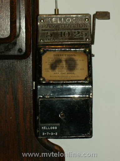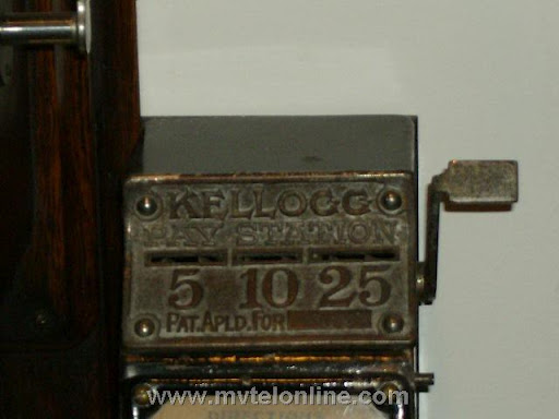 Kellogg coin collector, manufactured by Baird. The collector has slots for nickel, dime & quarter. When a coin is dropped into the correct slot and then the arm is pulled a sound is made unique to the inserted denomination. The sound would resonate from the collector, through the bracket to the telephone and then be picked up by the transmitter for the operator to hear. My collector is mounted to an antique Chicago 2 box telephone.