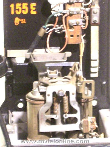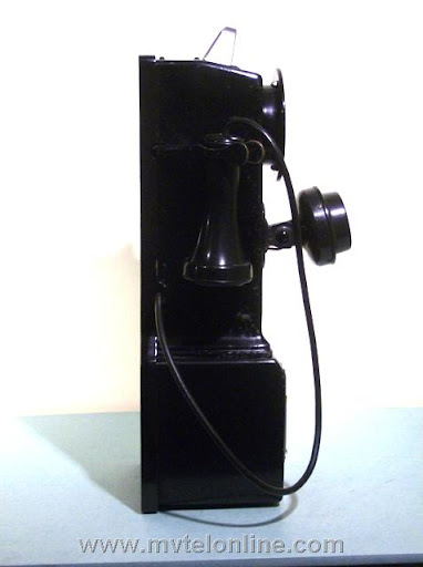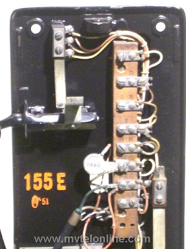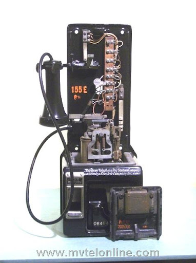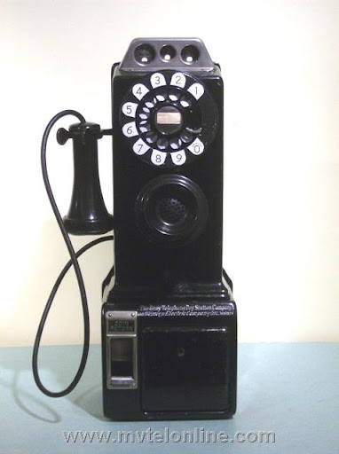 Western Electric 155E, 10 cent automatic prepay payphone or paystation. This antique telephone probably started out as a Gray 150G or similar model. It was converted by Western Electric to 10 cent operation. Note the numbers only daisy around the dial. Equipped with WE 2 coil relay and 706 receiver and the 635 "bulldog" transmitter.