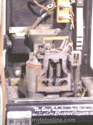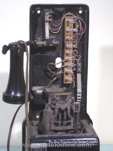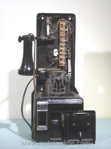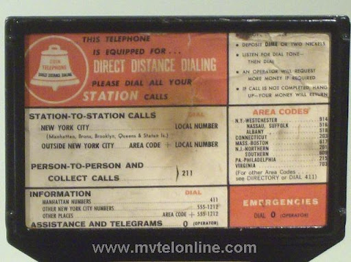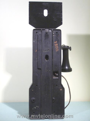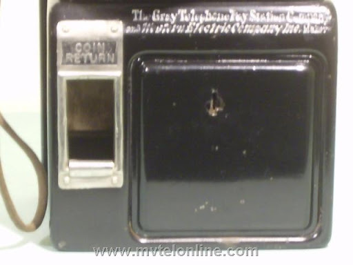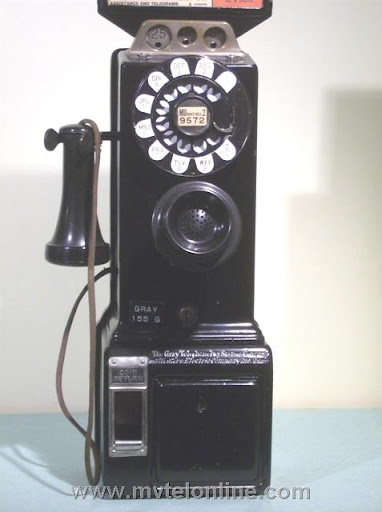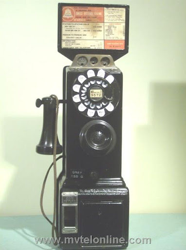 Western Electric 155G, 10 cent automatic prepay payphone or paystation. This antique telephone probably started out as a Gray 150G or similar model. It was converted by Western Electric to 10 cent operation. Note the Manhattan instruction card. Equipped with WE 2 coil relay and 706 receiver and the 635 "bulldog" transmitter.