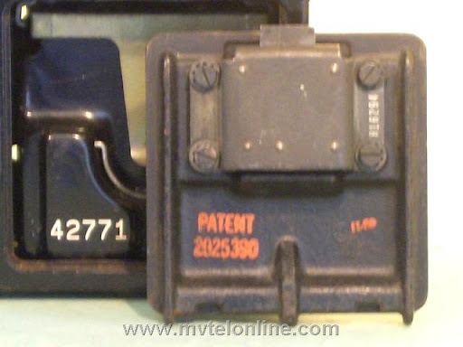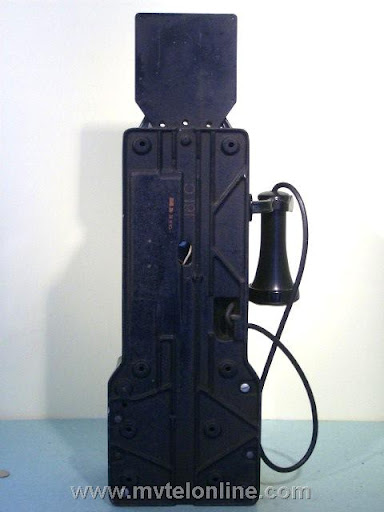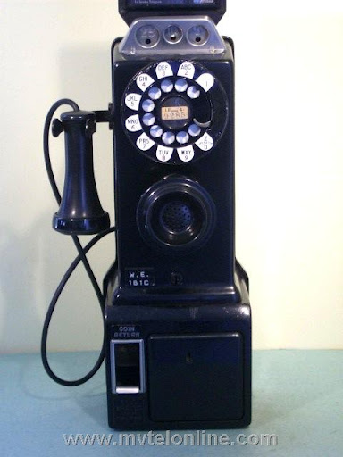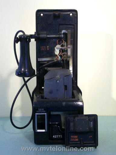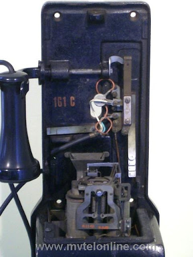 Western electric 161C, 5 cent automatic prepay. One of the first payphones or paystations manufactured by Western Electric. Unlike the 161A this model is unique with many changes from those manufactured by Gray. The hook is steel and the contact setup is totally different, this is the way the contact pileup remained until just before the end of Western Electric 3 slot production. Equipped with WE 2 coil relay and 706 receiver and the 635 "bulldog" transmitter.