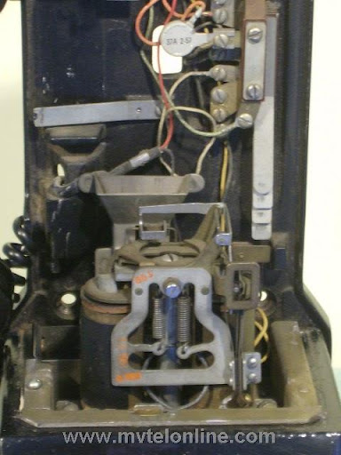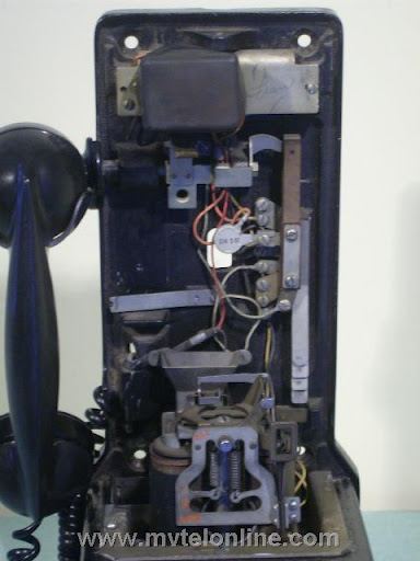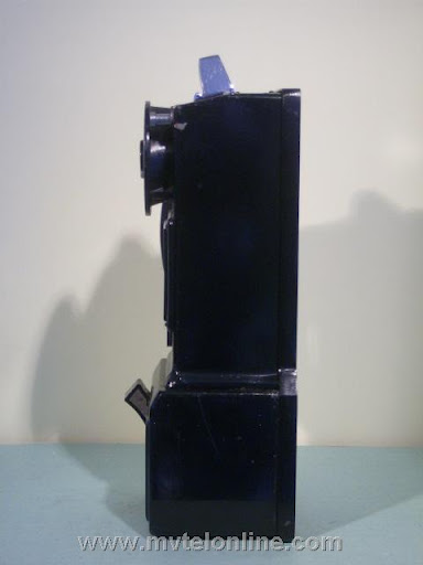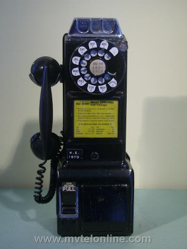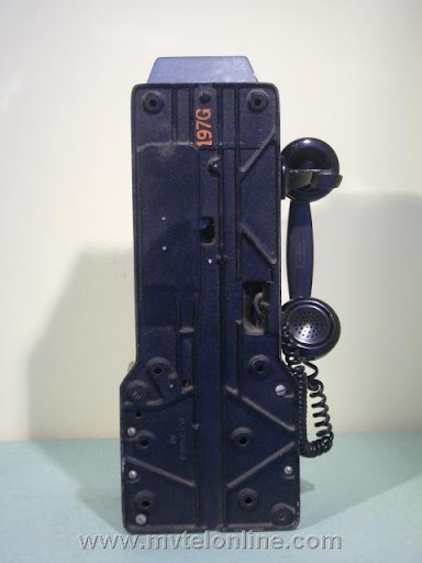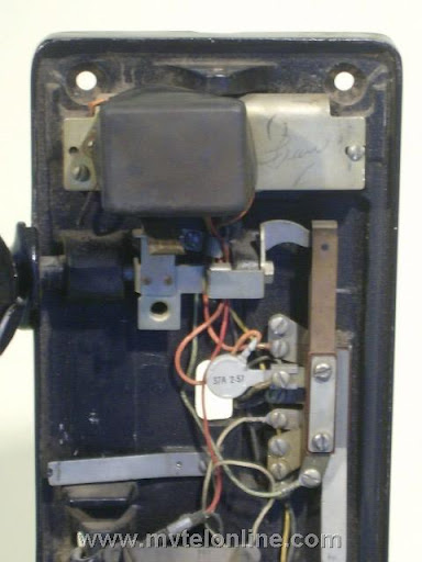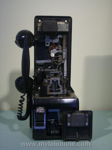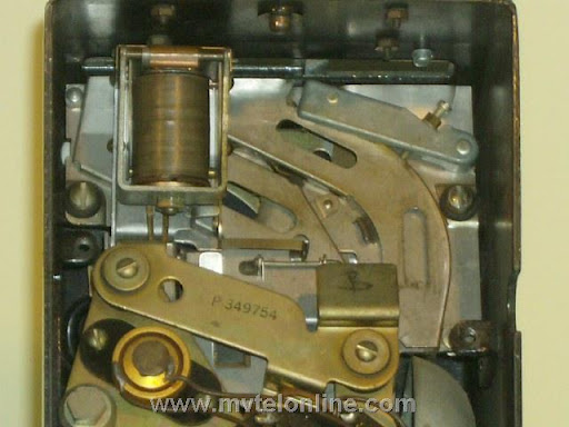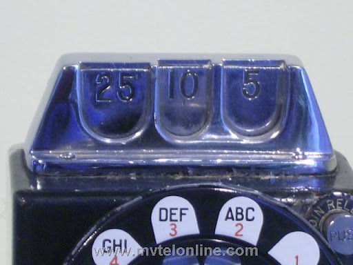 Western Electric 197GS, 10 cent automatic prepay payphone or paystation. This antique telephone has a coin gauge found on a few that came from Chicago, use of slugs was a problem there. The coin gauge is larger than a normal one, it has magnets in it to attract slugs and keep them from dripping into the phone. A special coin chute is used as well. The 197 is the first of Western Electric's models to be fitted with a coin return bucket and a coin return button.