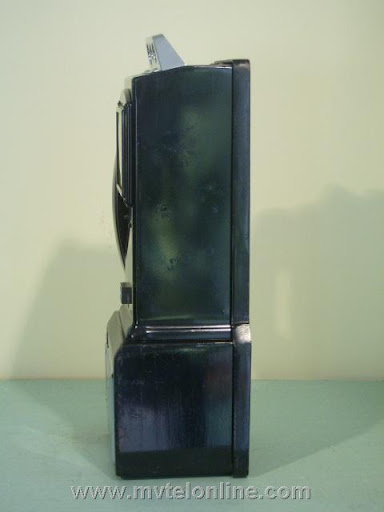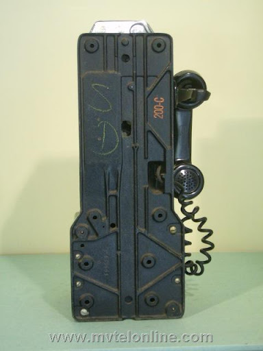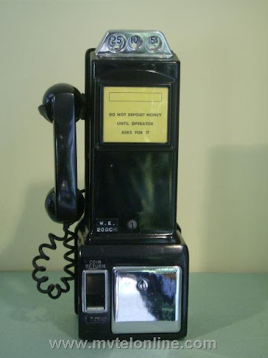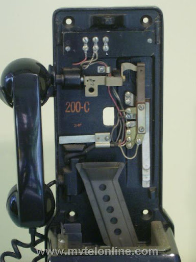 Western Electric 200C, manual post-pay payphone or paystation. The earlier 100 series had an internal induction coil and used an F handset, the 200 series no longer has the induction coil and introduces the G handset to payphones. This antique telephone was completely under the control of the operator.
