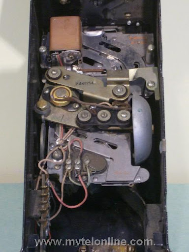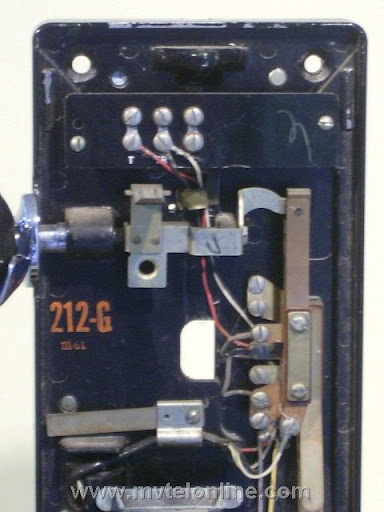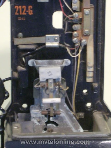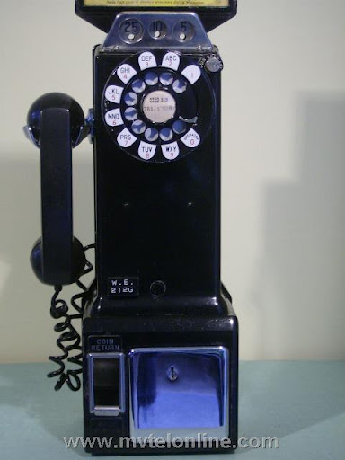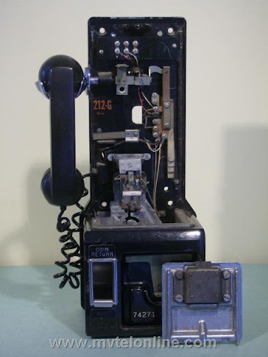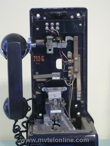 Western Electric 212G, automatic semi-post-pay payphone or paystation. Similar to the 210 but equipped with a coin return button. An other difference between the 210 and 212 is the 212 has washer rejectors as part of the coin gauge assembly. There was no coin return feature, coins dropped into the correct slots went to the coin box. As semi-post-pay phones worked, the user lifted the handset, dialed the desired number and deposited a dime or 2 nickels when a second dial tone was heard.